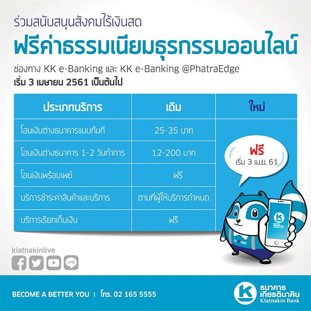 โดยธนาคารเกียรตินาคิน มีความยินดีที่จะ *ยกเว้นค่าธรรมเนียมการทำธุรกรรมทางการเงินทุกประเภทผ่านช่องทางออนไลน์ (Internet และ Mobile Banking) ผ่านทาง KK e-Banking และ KK e-Banking @PhatraEdge โดยเริ่มตั้งแต่วันที่ 3 เมษายน 2561 เป็นต้นไป ได้แก่