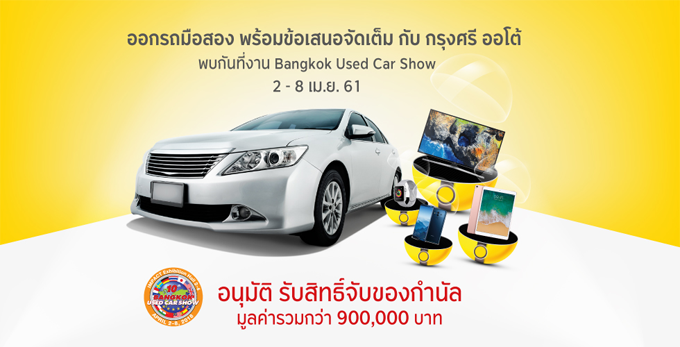 พบกรุงศรี ออโต้ ที่งาน Bangkok Used Car Show ออกรถมือสอง อนุมัติ รับสิทธิ์จับของกำนัล มูลค่ารวมกว่า 900,000 บาท บูธ กรุงศรี ออโต้ เอ็กซิบิชั่น ฮอลล์ 2 - 4 เมืองทองธานี วันที่ 2 - 8 เม.ย. 61 เวลา 12.00 - 22.00 น.
