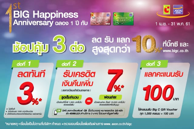 - เมื่อซื้อสินค้ามูลค่าตั้งแต่ 1,500 บาทขึ้นไป/ เซลล์สลิป ที่บิ๊กซี ซูเปอร์เซ็นเตอร์, บิ๊กซี เอ็กซ์ตร้า บิ๊กซี มาร์เก็ต และ บิ๊กซีช้อปปิ้งออนไลน์ www.bigc.co.th (ยกเว้นมินิบิ๊กซี) เฉพาะบัตรเครดิตบิ๊กซี แพลทินัม เพย์เวฟ หรือ