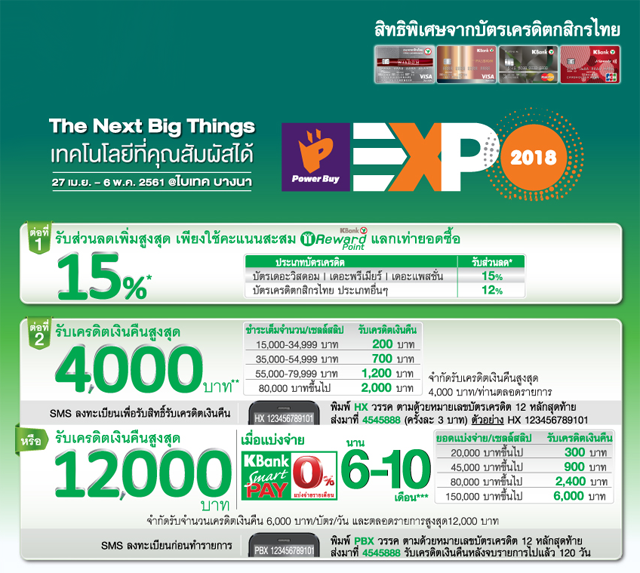รับส่วนลด/ เครดิตเงินคืนสูงสุด 12,000 บาท ในงาน Power Buy Expo 2018 จากบัตรเครดิตกสิกรไทย