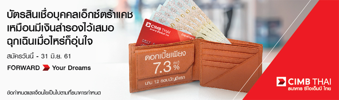 ข้อกำหนดและเงื่อนไขสิทธิพิเศษนี้เฉพาะลูกค้าใหม่ที่สมัครบัตรสินเชื่อบุคคลเอ็กซ์ตร้าแคช ของ ธนาคาร ซีไอเอ็มบี ไทย จำกัด (มหาชน)("ธนาคาร") ระหว่างวันที่ 15 มี.ค. - 31 ธ.ค. 61