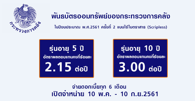 กระทรวงการคลังออกจำหน่ายพันธบัตรออมทรัพย์ของกระทรวงการคลัง ในปีงบประมาณ พ.ศ. 2561 ครั้งที่ 2 (แบบไร้ใบตราสาร-Scripless) จำนวนรวม 30,000 ล้านบาท แบ่งเป็น 2 รุ่น คือ รุ่นอายุ 5 ปี และรุ่นอายุ 10 ปี อัตราดอกเบี้ยแบบคงที่