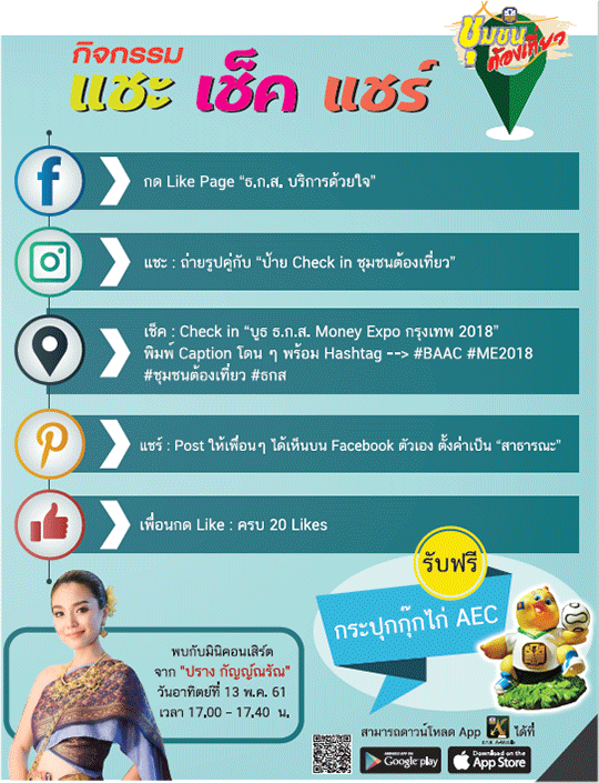 สำหรับบูธ ธ.ก.ส. ปีนี้นอกจากมีบัญชีเงินฝากน่าสนใจ ทั้งบัญชีเงินฝากทวีโชค ที่แจกโชคใหญ่ทั่วประเทสทุกปี บัญชีเงินออมลูกรัก ที่จะช่วยเป็นหลักประกันการศึกษา และอนาคตทางการเงินของลูกรักแล้ว ยังมีกิจกรรม แชะ เช็ค แชร์ ชุมชนต้องเที่ยวให้ผู้เข้าเยี่ยมชมบูธได้ร่วมสนุกกันอีกด้วยนะคะ
