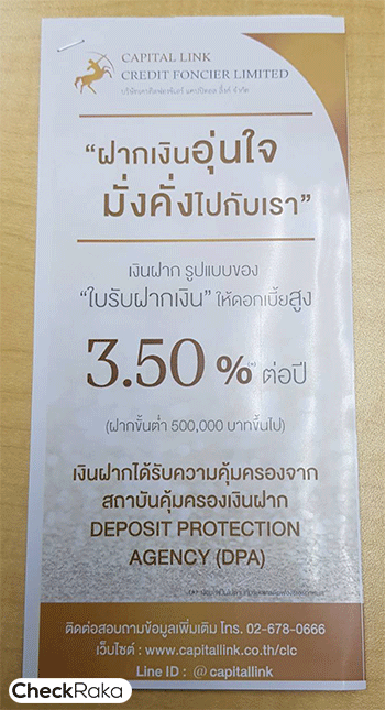 แถมท้ายกันกับ บ.เครดิตฟองซิเอร์ แคปปิตอลลิ้งค์นะคะ เผื่อใครสนใจกับการฝากเงินในรูปแบบ "ใบรับฝากเงิน" ให้ดอกเบี้ยสูง 3.50% ต่อปี (ฝากขั้นต่ำ 500,000 บาทขึ้นไป)