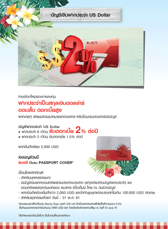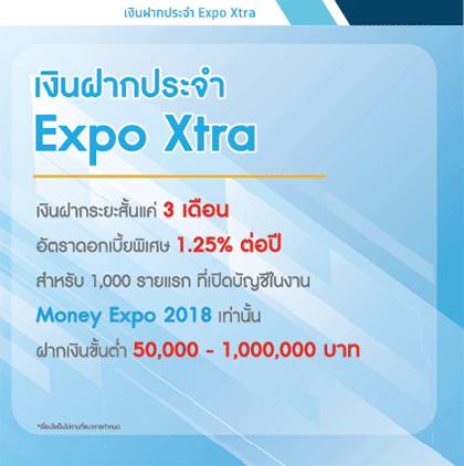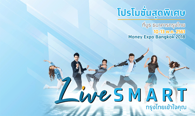 บูธของธนาคารกรุงไทยปีนี้ มากับคอนเซป "Live Smart" กรุงไทยเข้าใจคุณ มาพร้อมโปรโมชั่นน่าสนใจมากมาย สำหรับโปรโมชั่นเงินฝากในงาน จะเป็นเงินฝากประจำ Expo Xtra เป็นเงินฝากประจำระยะสั้น 3 เดือน อัตราดอกเบี้ยพิเศษ 1.10% ต่อปี เงินฝากขั้นต่ำ 50,000 - 1,000,000 บาท พิเศษ! สำหรับ 1,000 รายแรกที่เปิดบัญชีในงาน Money Expo 2018 เท่านั้น