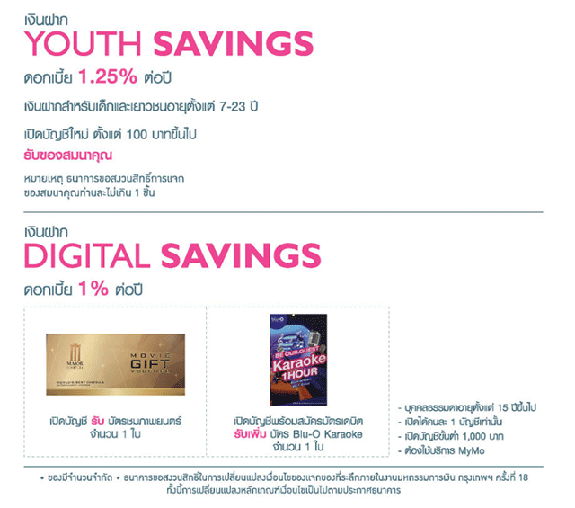 ก้าวสู่ความมั่งคั่ง มั่นคง ยั่งยืน กับธนาคารออมสิน ตอบโจทย์ของคนไทยมิติใหม่ สู่ยุค 5.0 นำมากับบัญชีเงินฝากเผื่อเรียกพิเศษ 105 วัน อัตราดอกเบี้ยเฉลี่ย 4.00% ต่อปี (ยกเว้นภาษี), เงินฝาก Youth Savings รับฝากอายุ 7-23 ปี อัตราดอกเบี้ย 1.25% ต่อปี เปิดบัญชี 100 บาท และรับกระปุกออมสิน Gsb Football, สลากออมสินพิเศษ 3 ปี หน่วยละ 50 บาท อัตราดอกเบี้ย 0.60 บาท ฝาก 5,000,000 บาทขึ้นไป รับกล้องติดรถยนต์ทันที