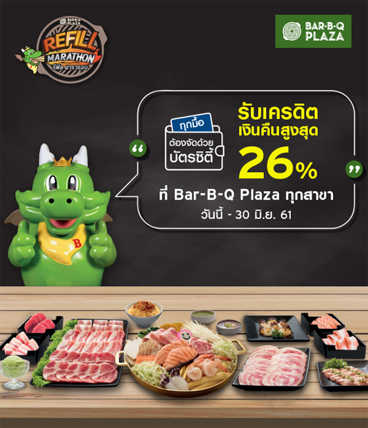 รายละเอียดโปรโมชั่น : รับเครดิตเงินคืนสูงสุด 26% ที่ Bar-B-Q Plaza ทุกสาขา