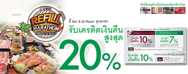 รายละเอียดโปรโมชั่น : รับเครดิตเงินคืนสูงสุด 20% ที่ร้าน Bar-B-Q Plaza ทุกสาขา
