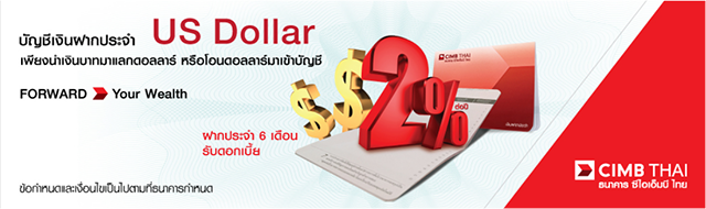 บัญชีเงินฝากประจำ US Dollar ฝากประจำ 6 เดือน รับดอกเบี้ย 2% จาก ธ.ซีไอเอ็มบี ไทย