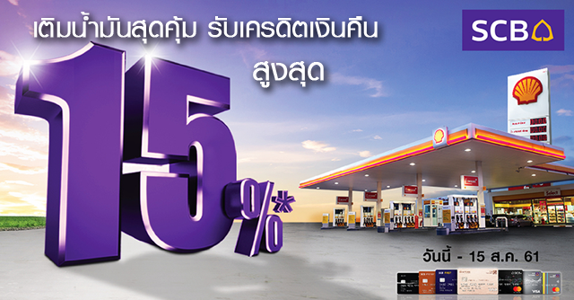เติมน้ำมันสุดคุ้ม รับเครดิตเงินคืนสูงสุด 15% ที่สถานีบริการน้ำมันเชลล์ทั่วประเทศ จากบัตรเครดิต SCB