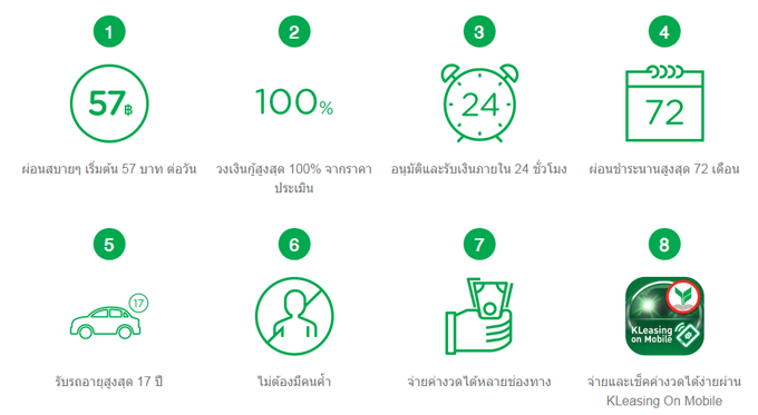 - หลักเกณฑ์และเงื่อนไขอื่นๆ เป็นไปตามที่ บจก. ลีสซิ่งกสิกรไทย กำหนด
