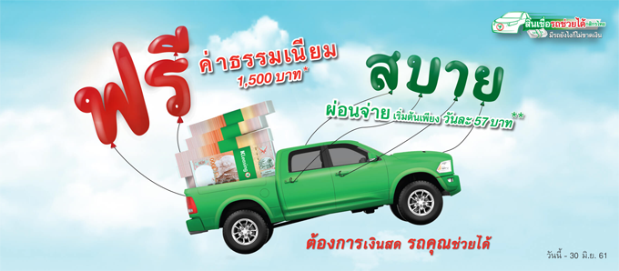 - สิทธิพิเศษผ่อนค่างวดเริ่มต้น 57 บาทต่อวัน (คำนวณจากวงเงินสินเชื่อ 100,000 บาท กรณีวงเงินสินเชื่อสูงกว่า 100,000 บาท ค่างวดจะสูงขึ้น) เฉพาะลูกค้าที่มีกำหนดระยะเวลาผ่อนชำระ 72 เดือน ด้วยดอกเบี้ยลดต้นลดดอก 7.42% ต่อปี และเป็นรถจดทะเบียนตั้งแต่ปี พ.ศ. 2555 เป็นต้นไป เท่านั้น