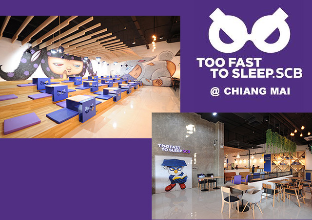 Too Fast To Sleep.SCB ตั้งอยู่บนชั้น 2 ของธนาคารไทยพาณิชย์ สาขาคณะแพทยศาสตร์เชียงใหม่ มีพื้นที่กว่า 400 ตารางเมตร สามารถรองรับผู้ใช้บริการได้มากกว่า 180 คน มีลักษณะเป็นเหมือนร้านกาแฟในรูปแบบห้องสมุด มีที่นั่งหลายโซน ทุกอย่างได้รับการออกแบบสวยงาม พร้อมทั้งมีเครื่องดื่มและเบเกอรี่ คอยให้บริการตลอด 24 ชั่วโมง นอกจากนี้ยังมีบริการ Wi-Fi และปลั๊กไฟเพื่อสำหรับชาร์ตอุปกรณ์อิเล็กทรอนิกส์ เพียงแสดงแอปพลิเคชัน SCB EASY บนสมาร์ทโฟน บัตรเดบิต บัตรเครดิต หรือสมุดเงินฝากไทยพาณิชย์อย่างใดอย่างหนึ่งก็สามารถเข้าใช้บริการ Too Fast To Sleep.SCB แห่งนี้ได้ทันที