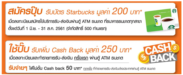 สมัครปุ๊บ รับบัตร Starbucks มูลค่า 200 บาท* เมื่อลงทะเบียนสมัครใช้บริการรับ-ส่งเงินผ่านตู้ ATM ธนชาต ที่ธนาคารธนชาตทุกสาขา ตั้งแต่วันที่ 1 มิ.ย. - 31 ส.ค.2561 (จำกัดสิทธิ์ 500 ท่านแรก)