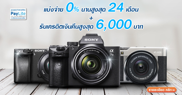 แบ่งจ่าย 0% นานสูงสุด 24 เดือน พร้อมรับเครดิตเงินคืนสูงสุด 6,000 บาท เมื่อซื้อกล้องถ่ายรูป เลนส์ และอุปกรณ์ ณ ร้านค้าที่ร่วมรายการ ด้วย