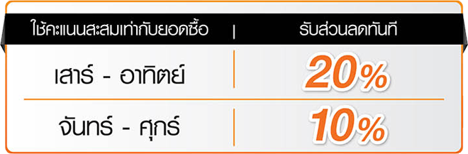 - เมื่อใช้คะแนนเท่ายอดซื้อ/ เซลล์สลิป และมียอดใช้จ่ายผ่านบัตรฯ 1,000 บาทขึ้นไป/ เซลล์สลิป รับส่วนลด 10% วันจันทร์ถึงวันศุกร์ และรับส่วนลด 20% สำหรับยอดใช้จ่ายในวันเสาร์อาทิตย์