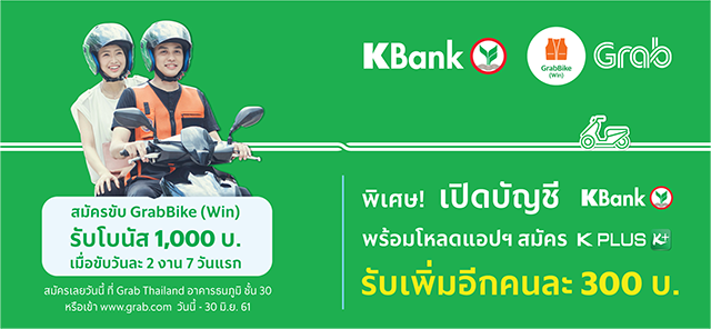 - ลูกค้าจะต้องสมัครบริการ K PLUS ผ่านช่องทางออนไลน์บนแอปพลิเคชัน K PLUS หรือ สาขาธนาคารกสิกรไทย หรือสมัครที่บูทธนาคารกสิกรไทยที่ สนญ.Grab โดยต้องทำการผูกบัญชีธนาคารกสิกรไทยกับแอปพลิเคชัน Grab Wallet รับเงินเพิ่มเข้าบัญชี 300 บาท สำหรับพี่วินป้ายเหลือง, รับเงินเพิ่มเข้าบัญชี 200 บาท สำหรับพี่วินป้ายขาว GrabCar และอื่นๆ