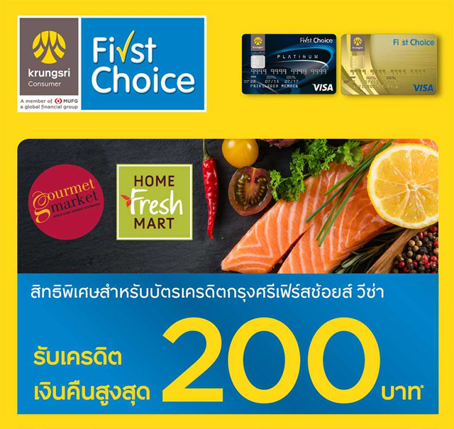 รับคืนสูงสุด 200.- เมื่อใช้จ่ายที่ Gourmet market และ Home Fresh Mart ผ่านฯ กรุงศรีเฟิร์สช้อยส์ วีซ่า