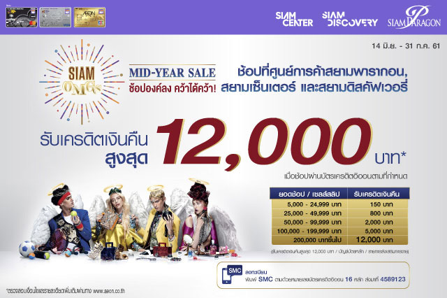 Siam OMGs Mid Year Sale 2018 รับเครดิตเงินคืนสูงสุด 12,000 บาท เมื่อช้อปที่ศูนย์การค้าสยามพารากอน สยามเซ็นเตอร์ และสยามดิสคัฟเวอรี่ (ยกเว้นห้างสรรพสินค้า) ผ่าน