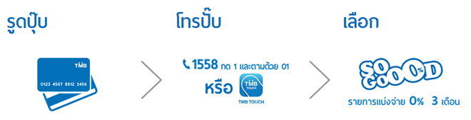 - โทรปั๊บ.. เพื่อทำรายการแบ่งจ่ายรายเดือนกับเจ้าหน้าที่ TMB หรือเลือกทำรายการด้วยตนเอง ผ่าน TMB Touch / TMB Internet Banking ก่อนวันสรุปยอดบัญชี
