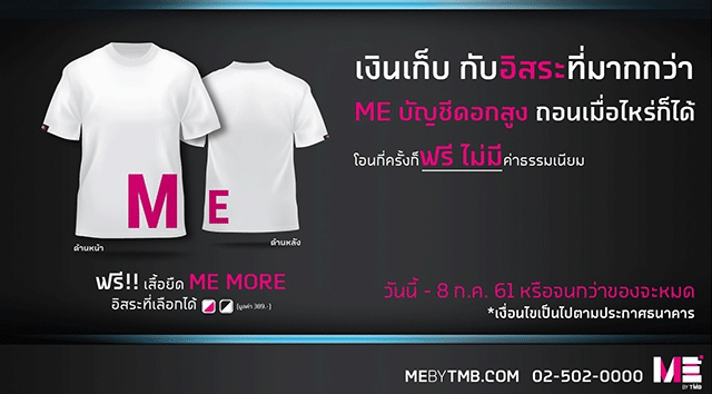"เงินเก็บ กับอิสระที่มากกว่า" โปรโมชั่นสำหรับลูกค้าใหม่ ที่ยังไม่มีบัญชี ME เปิดบัญชีวันนี้ รับฟรี! ME MORE T-Shirt มูลค่า 389 บาท มีให้เลือก 2 สี (เสื้อสีขาว ตัวอักษรสีชมพูสุดคูล หรือ เสื้อสีดำ ตัวอักษรสีขาวสุดเท่)