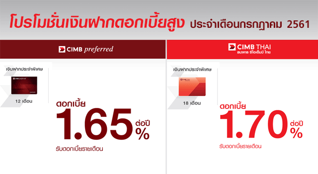 โปรโมชั่นบัญชีเงินฝากดอกเบี้ยสูงประจำเดือนกรกฎาคม 2561 จากธนาคารซีไอเอ็มบี ไทย บัญชีเงินฝากประจำแบบมีกำหนดระยะเวลาที่ให้ดอกเบี้ยสูง และสามารถเลือกรับดอกเบี้ยแบบรายเดือน หรือเมื่อครบกำหนดได้