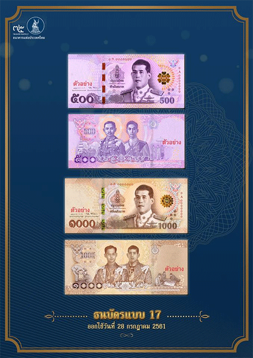 นายวิรไท สันติประภพ ผู้ว่าการ ธนาคารแห่งประเทศไทย (ธปท.) แถลงเรื่อง ธปท. จะออกใช้ธนบัตรแบบใหม่ แบบ 17 ชนิด ราคา 500 บาท และ 1,000 บาท ในวันเฉลิมพระชนมพรรษา สมเด็จพระเจ้าอยู่หัวมหาวชิราลงกรณ บดินทรเทพยวรางกูร วันที่ 28 กรกฎาคม 2561 ตามที่ได้รับพระราชทานพระราชานุญาตจากสมเด็จพระเจ้าอยู่หัวมหาวชิราลงกรณ บดินทรเทพยวรางกูร ให้จัดพิมพ์และออกใช้ธนบัตรแบบใหม่ เพื่อใช้เป็นธนบัตรหมุนเวียนทั่วไป