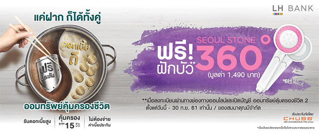 พิเศษ! เปิดบัญชีออมทรัพย์คุ้มครองชีวิต 2 พร้อมลงทะเบียนผ่านเว็บไซต์ธนาคาร รับฟรี! ฝักบัว SEOUL STONE 360 จำนวน 1 ชิ้น มูลค่า 1,490 บาท