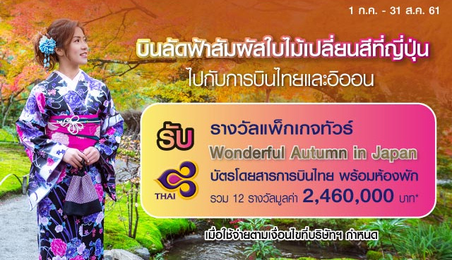 - ลุ้นรับ! แพ็กเกจทัวร์ญี่ปุ่น บัตรโดยสารการบินไทย (ชั้นประหยัด) พร้อมห้องพัก (Wonderful Autumn in Japan) รางวัลละ 2 ที่นั่ง จำนวน 10 รางวัล มูลค่ารวม 2,000,000 บาท* เงื่อนไขการรับสิทธิ์ ดังนี้