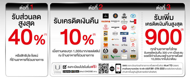 - ต่อที่ 3 รับเพิ่ม! เครดิตเงินคืนสูงสุด 900 บาท ทุกร้านอาหารทั่วไทย (รับเครดิตเงินคืน 300 บาท เมื่อสะสมยอดใช้จ่ายในหมวดร้านอาหารตั้งแต่ 10,000 บาทขึ้นไป/ เซลล์สลิป)