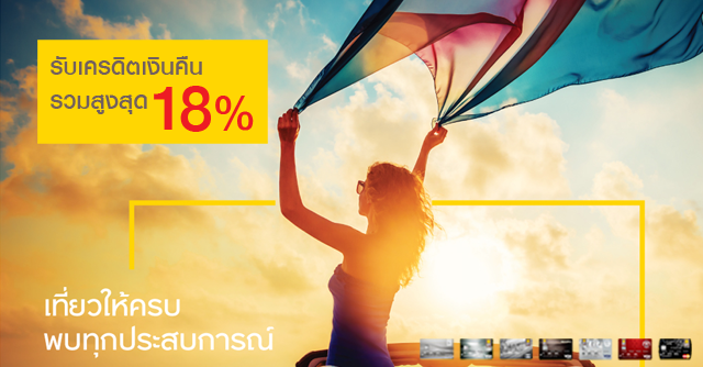 เที่ยวให้ครบ พบทุกประสบการณ์ รับเครดิตเงินคืนสูงสุด 18% เมื่อใช้จ่ายในหมวดท่องเที่ยวตามเงื่อนไข (เฉพาะการใช้ยอดใช้จ่ายภายในประเทศ และเป็นสกุลเงินบาทไทย) ผ่าน
