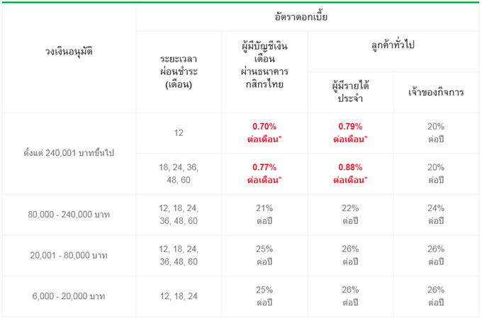 *ลูกค้าผู้มีบัญชีเงินเดือนผ่านธนาคารกสิกรไทยที่ได้รับอนุมัติวงเงินตั้งแต่ 240,001 บาทขึ้นไป รับดอกเบี้ยพิเศษต่ำสุด 0.70% ต่อเดือนและ 0.77% ต่อเดือน เป็นแบบอัตราคงที่แบบประมาณการ (flat rate) โดยคำนวณจากอัตราดอกเบี้ยแบบลดต้นลดดอก (Effective Rate) ในอัตรา 15% ต่อปี และ 16% ต่อปี โดยมีระยะเวลาการผ่อนชำระ 12 และ 60 เดือนตามลำดับ และลูกค้าผู้มีรายได้ประจำที่ได้รับอนุมัติวงเงินตั้งแต่ 240,001 บาทขึ้นไป รับดอกเบี้ยพิเศษต่ำสุด 0.79% ต่อเดือน และ 0.88% ต่อเดือน เป็นแบบอัตราคงที่แบบประมาณการ (flat rate) โดยคำนวณจากอัตราดอกเบี้ยแบบลดต้นลดดอก (Effective Rate) ในอัตรา 17% ต่อปี และ 18% ต่อปี และมีระยะเวลาการผ่อนชำระ 12 และ 60 เดือนตามลำดับ