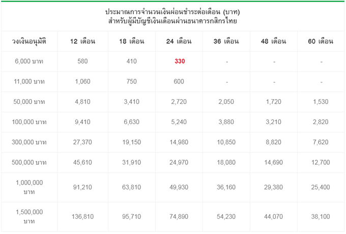 - จำนวนเงินผ่อนชำระเป็นตัวเลขประมาณการเท่านั้น ไม่สามารถนำมาเป็นหลักฐานอ้างอิง สำหรับผู้ประกอบการต้องการทราบยอดผ่อนชำระ กรุณาติดต่อธนาคารกสิกรไทยทุกสาขา