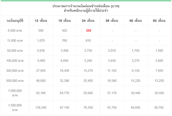 - ผ่อนชำระเงินสินเชื่อเริ่มต้น 330 บาทต่อเดือน คำนวณมาจากวงเงินอนุมัติขั้นต่ำ 6,000 บาท ระยะเวลาผ่อนชำระที่ 24 เดือน
