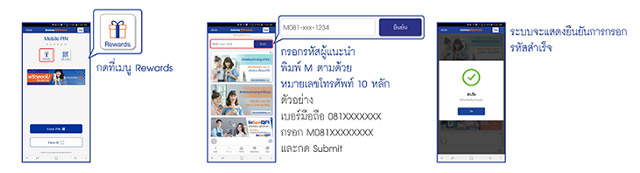 - เพื่อนที่สมัครใหม่จะต้องกรอก "รหัสผู้แนะนำ" ที่เมนู Rewards ในบัวหลวง เอ็มแบงก์กิ้งของตนเอง ภายในวันแรกที่สมัครและเข้าใช้บริการ (รหัสผู้แนะนำคือ m ตามด้วยหมายเลขโทรศัพท์ 10 หลัก ของผู้แนะนำที่ใช้สมัครบัวหลวง เอ็มแบงก์กิ้ง)