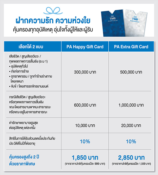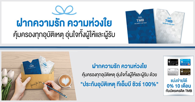 ฝากความรัก ความห่วงใยคุ้มครองทุกอุบัติเหตุ อุ่นใจทั้งผู้ให้และผู้รับด้วย "ประกันอุบัติเหตุ ทีเอ็มบี ชัวร์ 100%" ราคาสุดคุ้ม แบ่งจ่ายได้ 0% นาน 10 เดือน กับบัตรเครดิต TMB