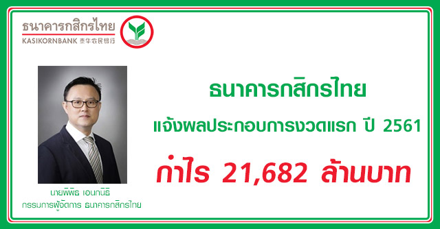 ธนาคารกสิกรไทย แจ้งผลประกอบการงวดแรก ปี 2561 กำไร 21,682 ล้านบาท
