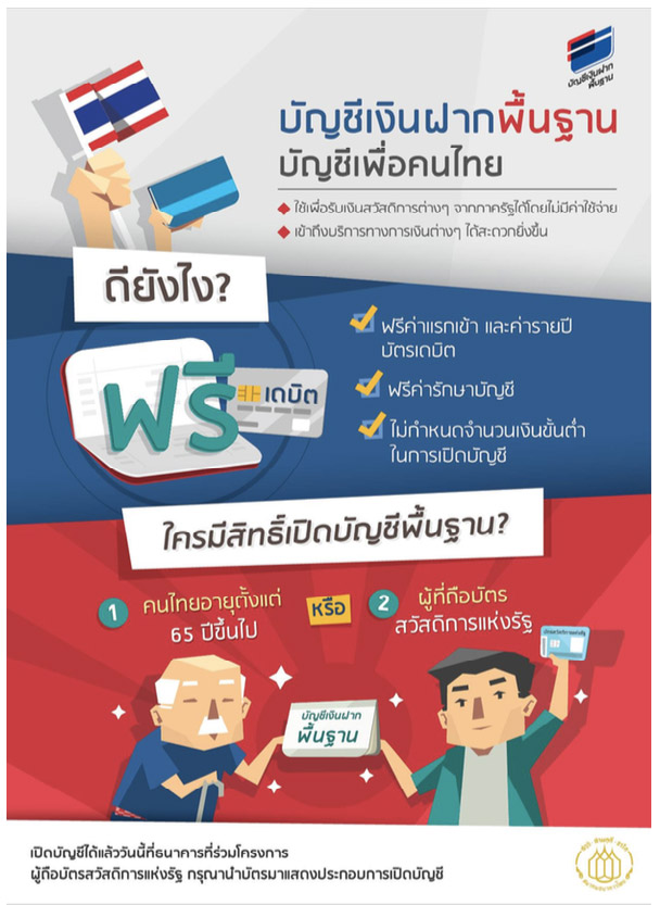 รายละเอียดเบื้องต้นของ "บัญชีเงินฝากพื้นฐาน" - ในระยะแรกเปิดให้บริการสำหรับประชาชนที่อยู่ในโครงการบัตรสวัสดิการแห่งรัฐ (สำหรับคนที่ลงทะเบียนโครงการนี้ไว้แล้ว) และผู้สูงอายุที่อายุ 65 ปีขึ้นไป