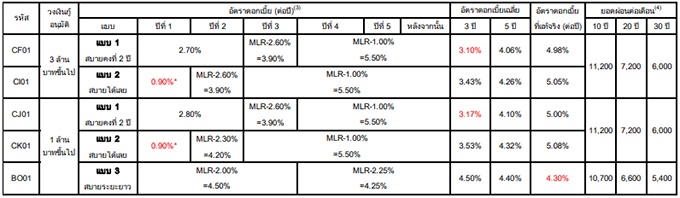 - อัตราดอกเบี้ยคำนวณจากดอกเบี้ย MLR = 6.50% ณ วันที่ 2 ก.ค. 2558 อนึ่ง ธนาคารสามารถประกาศปรับเปลี่ยนอัตราดอกเบี้ย MLR ได้ตามเกณฑ์ที่ธนาคารแห่งประเทศไทยกำหนดอนุญาตไว้ โดยทางธนาคารจะประกาศเป็นคราวๆ ไป และจะประกาศทางเว็บไซต์ของธนาคาร และปิดประกาศไว้ที่ตั้งสาขาของธนาคาร และอัตราดอกเบี้ยที่สูงขึ้นอาจทำให้จำนวนเงินค่างวดหรือจำนวนงวดในการผ่อนชำระเพิ่มมากขึ้นได้