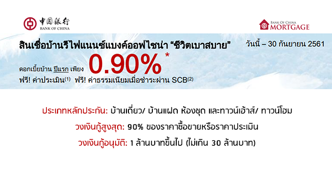 สินเชื่อบ้านรีไฟแนนซ์แบงค์ออฟไชน่า "ชีวิตเบาสบาย" ดอกเบี้ยปีแรกเพียง 0.90% ถึง 30 ก.ย. 61