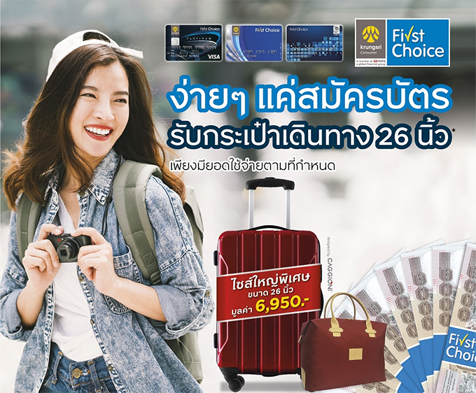 กรุงศรีเฟิร์สช้อยส์ บัตรกดเงินสดพร้อมใช้ พร้อมผ่อน 0% สมัครวันนี้ ฟรี! กระเป๋าเดินทางไซส์ใหญ่