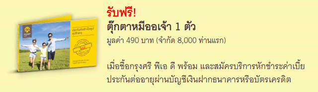 ซื้อกรุงศรี พีเอ ดี พร้อม กับธนาคารกรุงศรีอยุธยา และสมัครบริการหักชำระค่าเบี้ยประกันต่ออายุผ่านบัญชีเงินฝากธนาคารหรือบัตรเครดิต รับฟรี! ตุ๊กตาหมีออเจ้า 1 ตัว