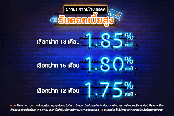 โปรโมชั่นบัญชีเงินฝากประจำดอกเบี้ยสูงจาก ธ.ไทยเครดิต ให้ดอกเบี้ยสูงสุด 1.85% ต่อปี