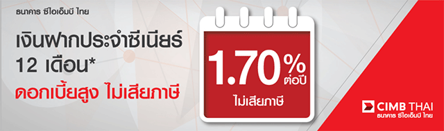 บัญชีเงินฝากประจำซีเนียร์ ระยะเวลาฝาก 12 เดือน* จาก ธ.ซีไอเอ็มบี ไทย ให้ดอกเบี้ยสูง 1.70% ต่อปี