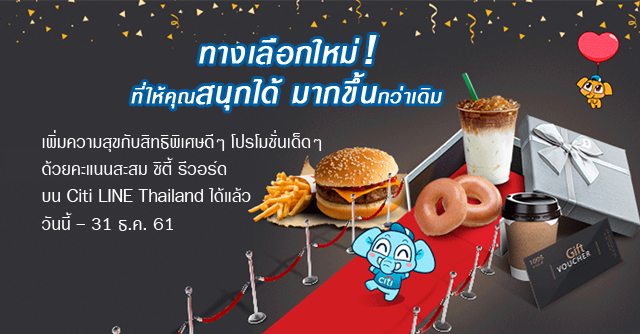ทางเลือกใหม่! ให้คุณสนุกได้ มากขึ้นกว่าเดิม เพิ่มความสุขกับสิทธิพิเศษดีๆ โปรโมชั่นเด็ดๆ ด้วยการแลกคะแนนสะสม ซิตี้ รีวอร์ด ผ่าน Citi LINE Thailand ได้แล้ววันนี้! จาก