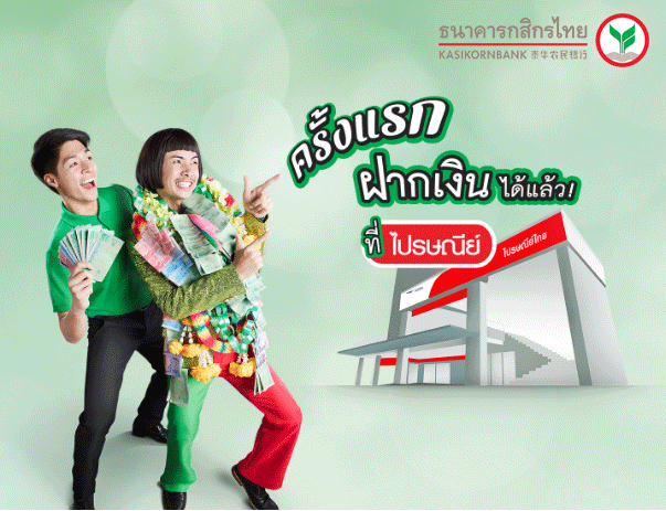 ครั้งแรก...กับ "บริการฝากเงินที่ไปรษณีย์" เข้าบัญชีเงินฝากธนาคารกสิกรไทย ทั้งประเภทบัญชีเงินฝากออมทรัพย์ และบัญชีเงินฝากกระแสรายวัน เพียงกรอกใบนำฝาก เพื่อแจ้งเลขที่บัญชีที่ต้องการฝากเงิน และจำนวนเงิน โดยผู้ฝากจะได้รับหลักฐานการทำธุรกรรม เมื่อทำรายการเสร็จสมบูรณ์เป็นใบเสร็จ และ SMS ซึ่งผู้รับปลายทางจะได้รับเงินโดยทันที