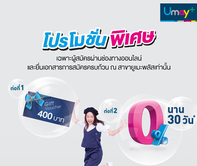 - ต่อที่ 1 รับ Gift voucher มูลค่าสูงสุด 400 บาท เพียงลงทะเบียนสมัครบัตรกดเงินสดยูเมะพลัส ผ่านช่องทางออนไลน์ และยื่นเอกสารการสมัครครบถ้วน ณ สาขายูเมะพลัสที่ร่วมรายการ