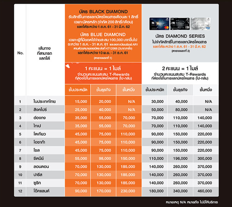 ตารางการแลกคะแนน T-Rewards เป็นบัตรโดยสารเครื่องบิน