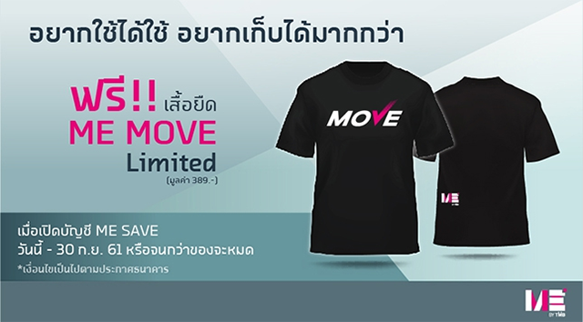 โปรโมชั่นสำหรับลูกค้าใหม่ ที่ยังไม่มีบัญชี...เพียงเปิดบัญชี ME SAVE พร้อมฝากเงิน 500 บาทขึ้นไป ที่ ME Place ,บูธ ME หรือสาขา TMB รับฟรี!! ME MOVE T-Shirt Limited มูลค่า 389 บาท