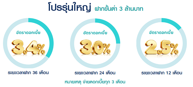 - วงเงินฝากขั้นต่ำ 3,000,000 บาท สำหรับระยะเวลาฝาก 12 , 24 และ 36 เดือน